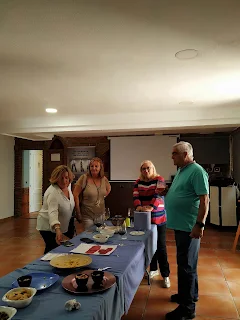 Lo que en el primer momento dio algo de miedo y echó para atrás a un par y un respeto considerable al resto en el primer cambio y que se fue transformando en un encuentro lleno de risas y retos. Pero sobre todo aprendizaje y descubrir tus miedos. Descubrir que tu paleta era una paleta corta o larga de color, de colores cálidos o fríos, que eras alguien con el dibujo libre o muy elaborado, que utiliza mucho agua o poco agua, que éramos más partidarios de la técnica húmedo sobre húmedo, o seco sobre húmedo. Hay quien que cuando le llego la acuarela tras varias manos, vio las acuarelas del revés y una campana se transformó en una copa. Las había que eran tan claras que solo era retocar un poco, otras en las que venga que hay que lavar y rehacer y ahí estaba Carlos con la fregona recogiendo los restos de agua en el suelo. Y la sorpresa final, las acuarelas ni mal, para que luego digan que las acuarelas no se pueden retocar.